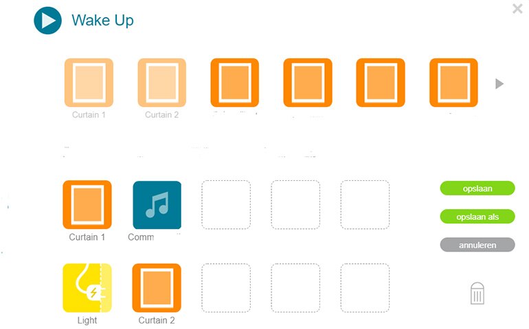 Forestil dig, at du vil have dit hjem forberedt til efterårsmånederne. Et 'efterår scenarie' kan eksempelvis omfatte følgende begivenheder: belysning tænder dæmpet og dine gardiner kører ned, så nysgerrige blikke holdes ude og stemningen i din bolig er hyggelig. Eller forestil dig din ideelle morgen 'vågne' scenarie, 'scenarie morgen', med lamper tændt, gardiner trækkes fra og din favorit-morgenmusikliste afspilles på dine højttalere, så du kan gå ind i køkkenet og lave en kop kaffe. Se eksempel nedenfor: